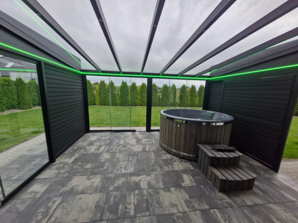Nowoczesne LED RGB pozwala nadać Twojemu tarasowi wyjątkowy klimat. Regulacja kolorów i natężenia światła umożliwia pełną kontrolę nad atmosferą. Energooszczędne diody zapewniają trwałość i niskie zużycie energii, a elegancka instalacja idealnie komponuje się z designem zadaszenia.